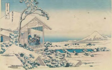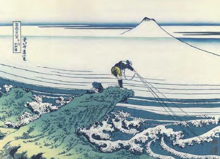 O ancora, Il Fuji visto dal mare, una xilografia contenuta nel secondo volume de Le cento vedute del monte Fuji, realizzato tra il 1834 e il 1835; in questo caso, l’acqua assume una dimensione monumentale, ma pacificata, abbandonando la violenza della sua celebre controparte di Kanagawa, accompagnando lo sguardo dello spettatore in un flusso armonico e privo di tensioni emotive. La grande massa d’acqua culmina in una schiuma che si disfa in frammenti, evocando i pivieri, uccelli costieri che, secondo la leggenda, nascono dalla spuma delle onde.